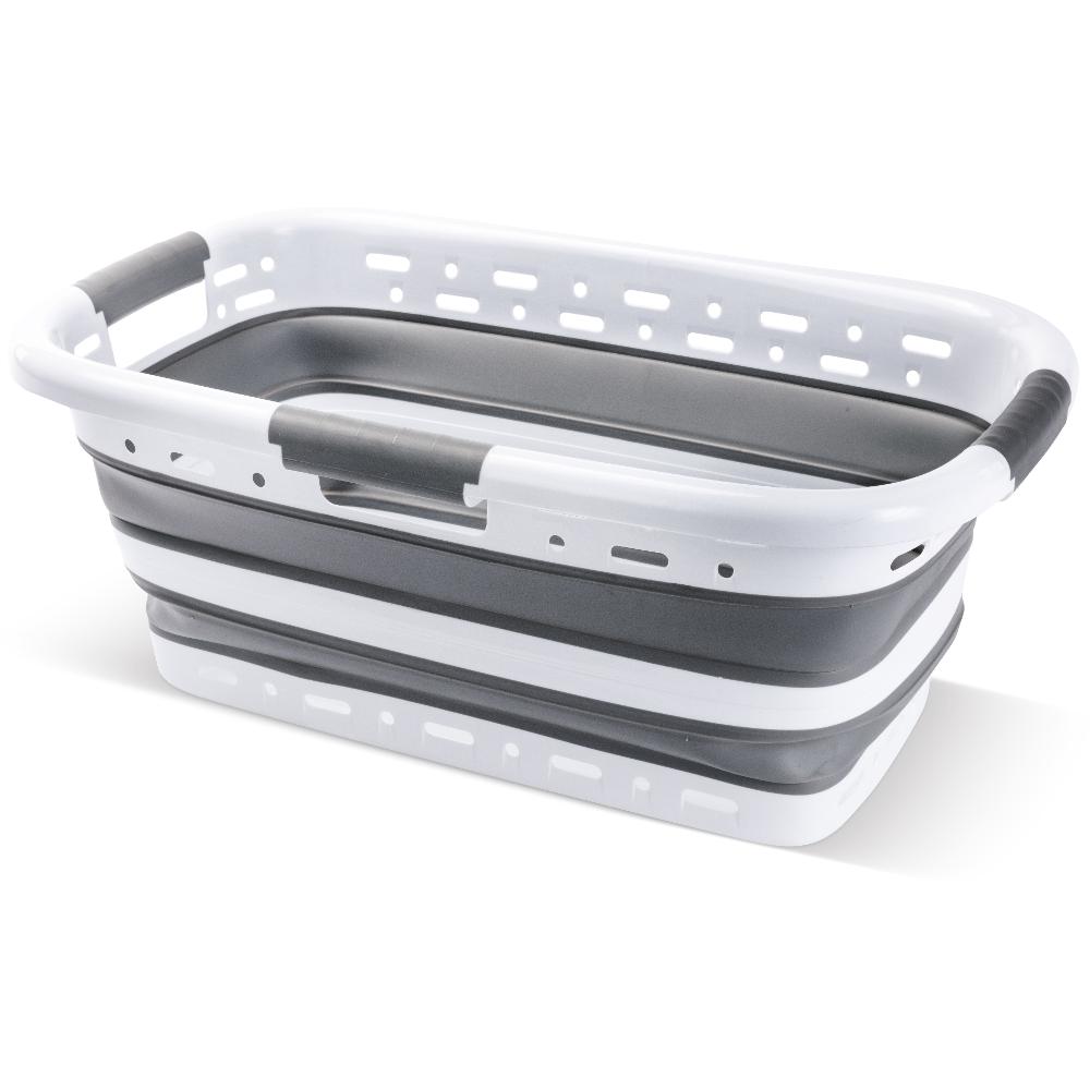 A practical foldable laundry basket made of durable PP plastic and silicone, ideal for carrying both dirty and clean laundry.