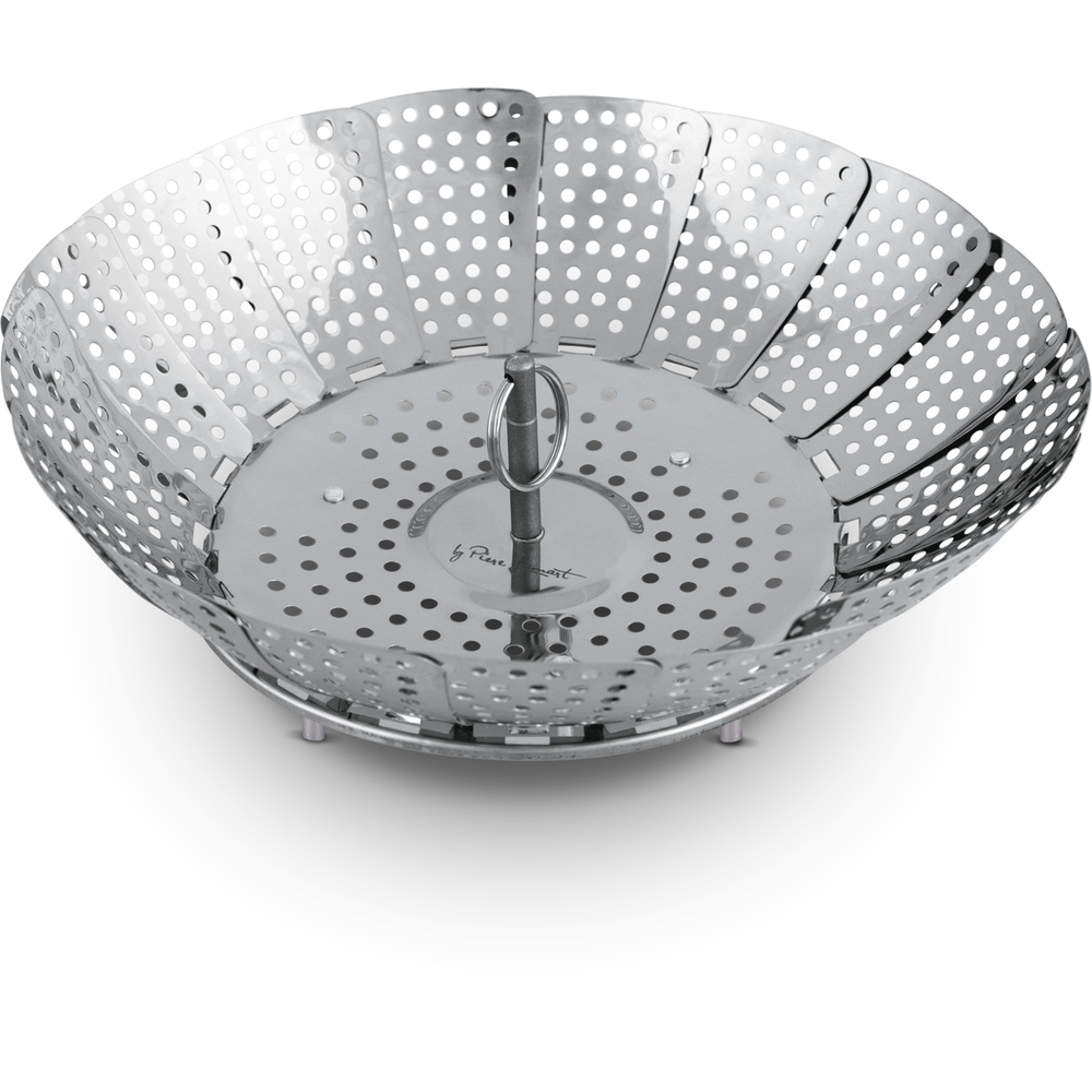 A foldable stainless steel steamer is suitable for steaming dumplings, cooking vegetables and other dishes in steam, preserving minerals and vitamins.