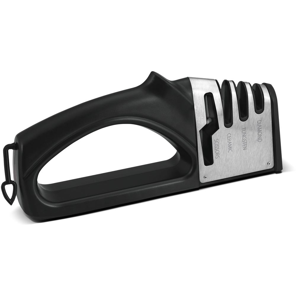 3-stage knife and scissors sharpener made from softened ABS plastics with an anti-slip base.