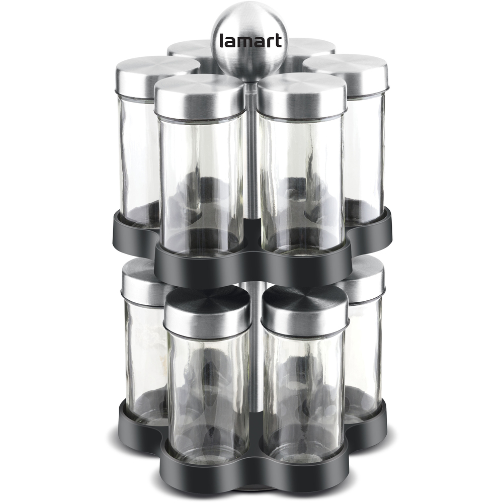 Set of spice jars on a rotating stand in a modern design.