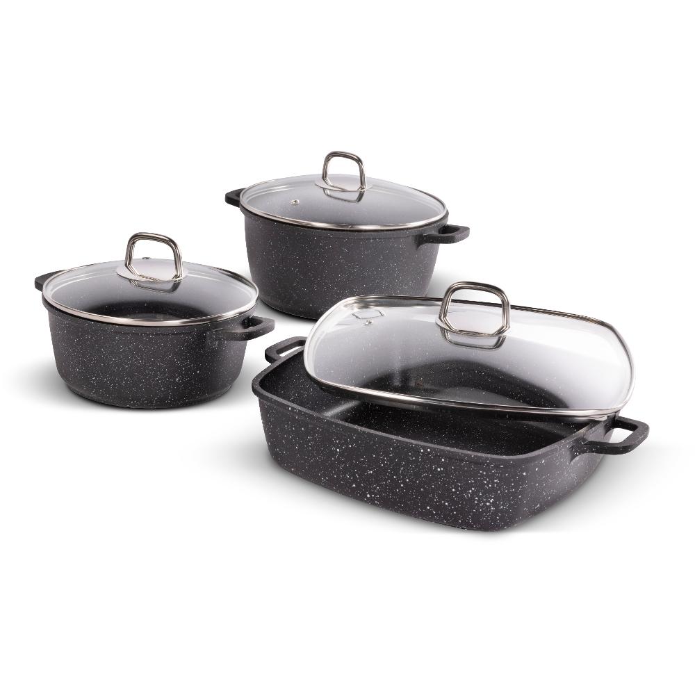The cookware is equipped with inadhesive surface resistant against scratching and burning, thick bottom with very elegant handles for greater safety, functionality and comfort.