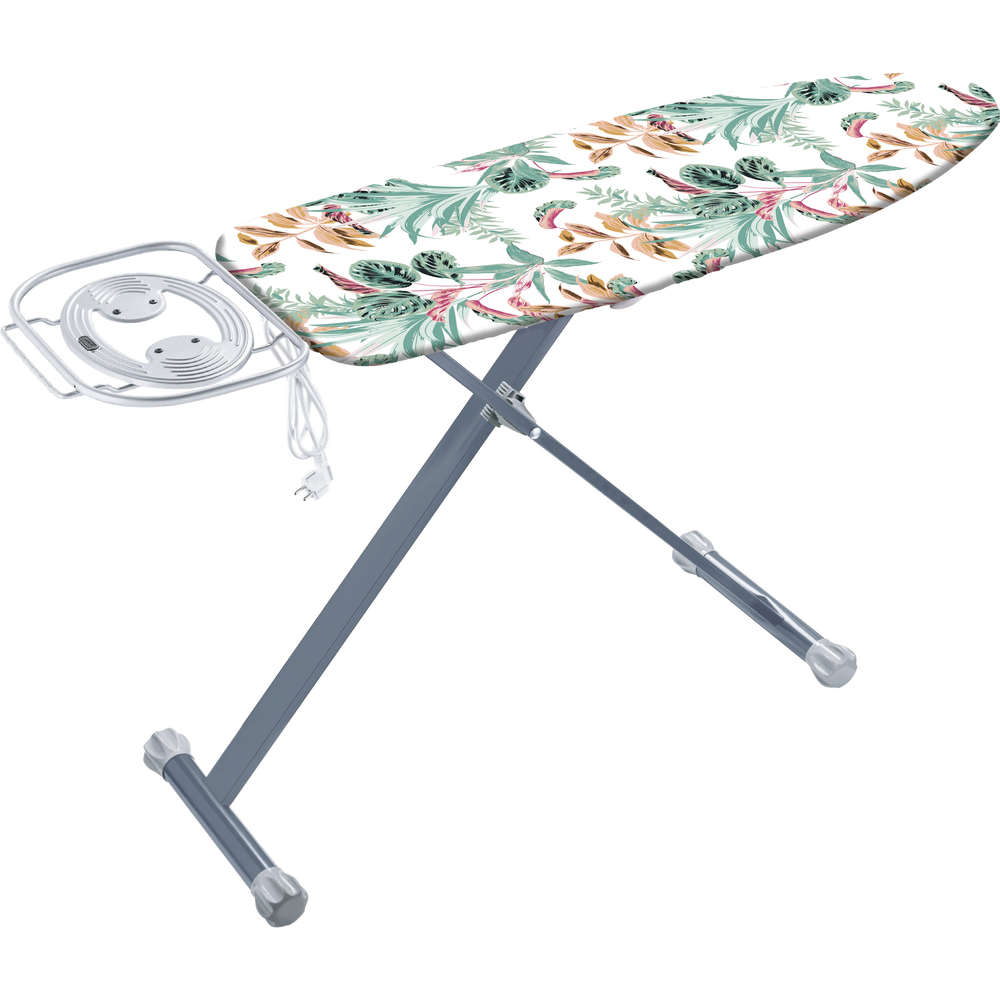 Quality ironing board fitted with a transport lock, steam dissipating ironing surface and electric power socket.