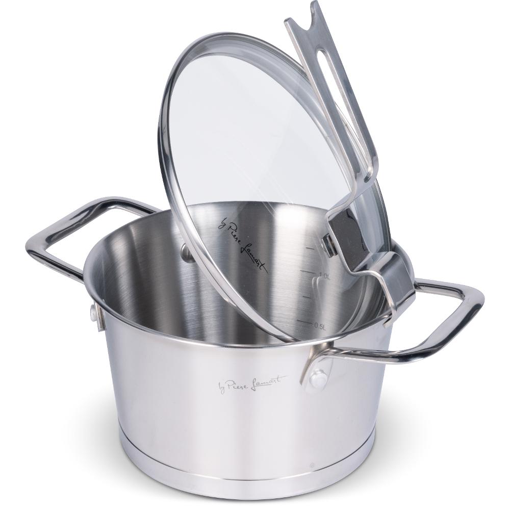 Design stainless steel cookware made from first-class corrosion resistant steel includes a solid sandwich base with very elegant handles for greater safety, functionality and comfort.