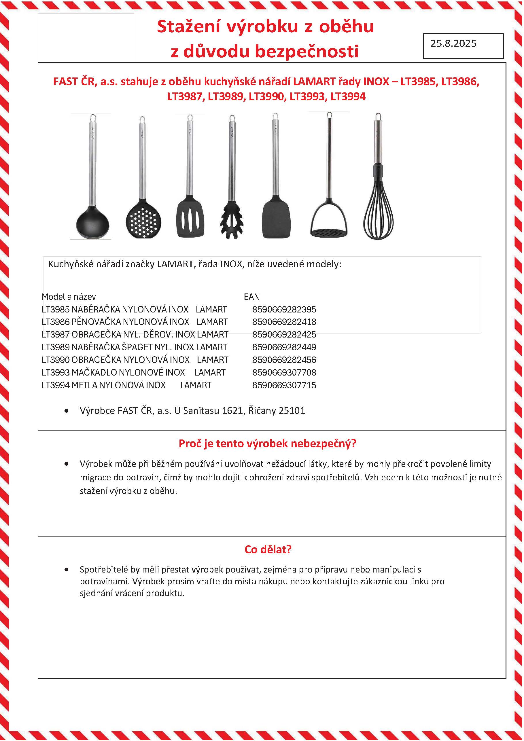 FAST ČR, a.s. stahuje z oběhu kuchyňské nářadí LAMART řady INOX – LT3985, LT3986,